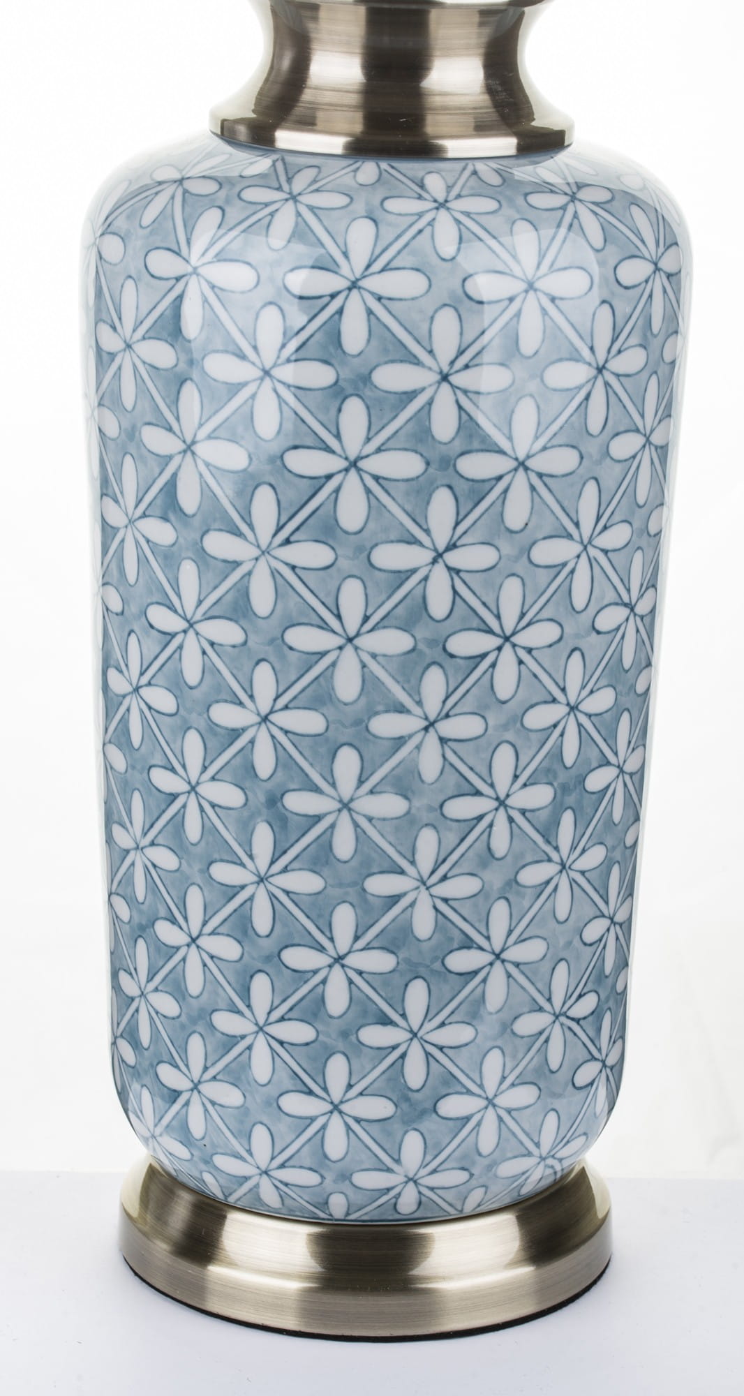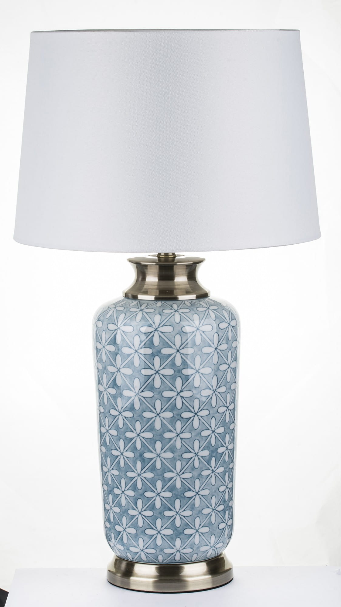 Efektowna lampa w charakterystycznym dla amerykańskiego designu stylu Hamptons. Będzie idealną ozdobą salonu, sypialni czy przedpokoju postawiona na konsoli. Posiada ozdobną, jasnoniebieską podstawę w delikatnym geometrycznym wzorze. Jest niezwykle elegancka a jej światło pomaga stworzyć przytulną i komfortową atmosferę w pomieszczeniu. Pasuje do wnętrz klasycznych, w stylu nowojorskim, Hamptons oraz glamour.