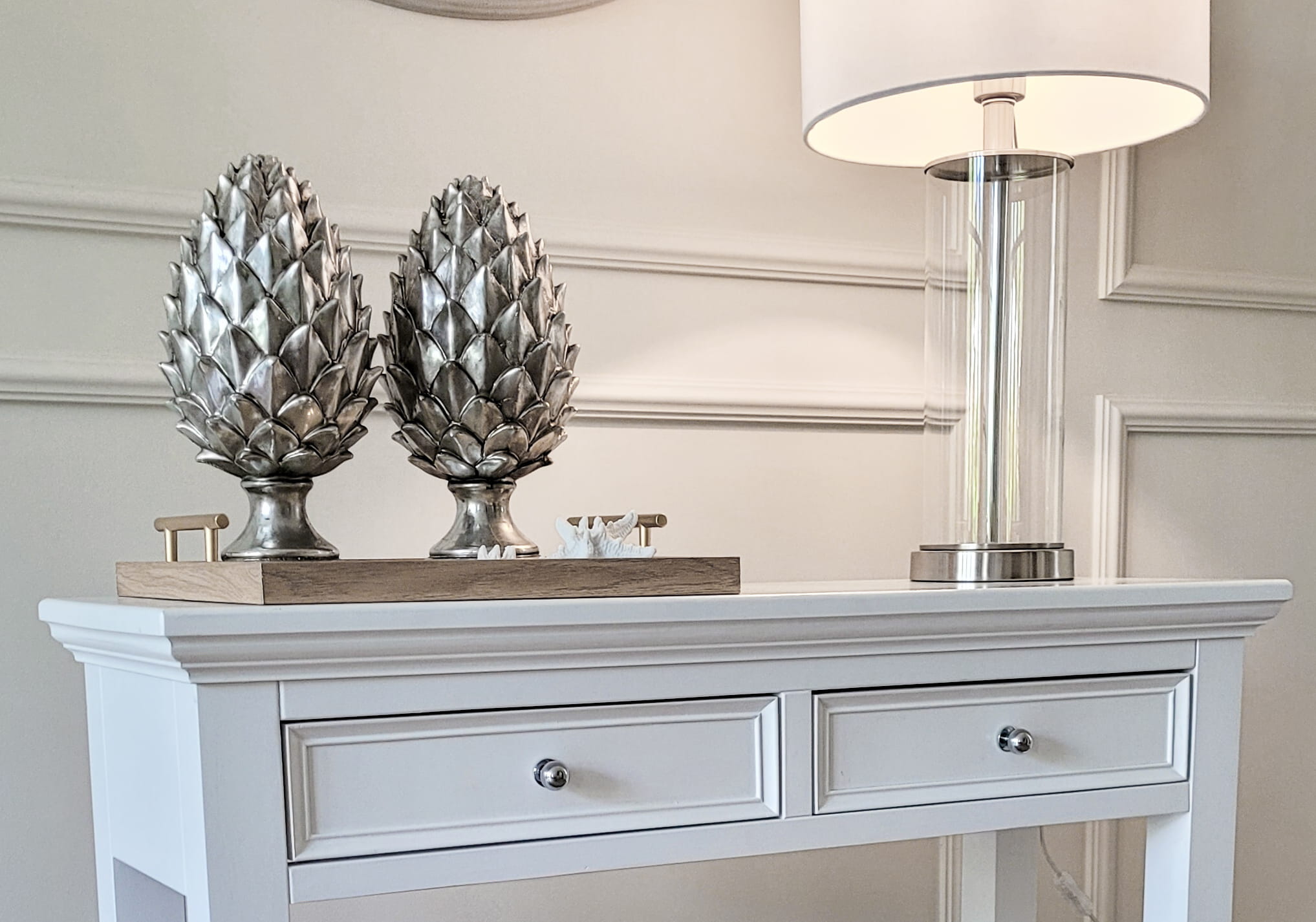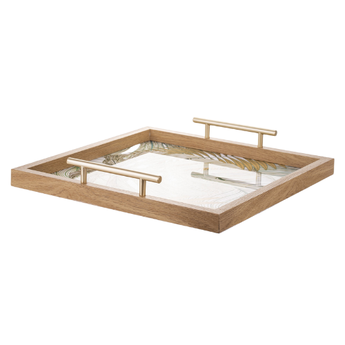 Elegancka drewniana taca z ozdobnymi,metalowymi uchwytami i szklaną podstawą z nadrukiem w kwiaty. Świetnie sprawdzi się jako dekoracja w jadalni, kuchni lub w salonie. Może służyć do eksponowania ozdób, np. świec, dekoracyjnych figurek lub serwowania posiłków. Będzie pasować do wnętrz utrzymanych w klimacie Hampton, Modern Farmhouse.