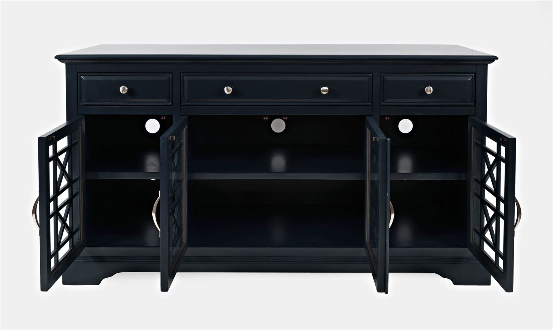 Ta piękna komoda sprawi, że każda stylowa aranżacja nabierze oryginalności i charakteru. Czerń wprowadzi atmosferę luksusu i elegancji. Komoda ta posiada cztery ażurowe drzwiczki z szybą oraz trzy szuflady. Idealna do wnętrz utrzymanych w klimacie nowojorskim, modern classic, glamour.