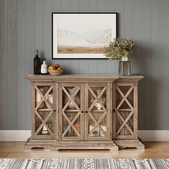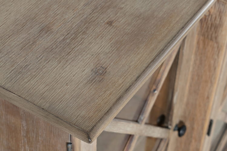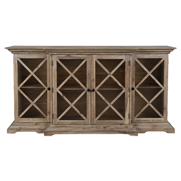 Elegancka komoda w stylu Hamptons w kolorze naturalnego drewna, z ozdobnymi zawiasami zewnętrznymi. Korpus został wykonany z drewna akacji i posiada szczotkowaną powierzchnię, malowaną na jednolity brązowy kolor. Przeszklone fronty posiadają ozdobne szprosy, które nadają niebanalnego charakteru całości komody, a także frezowany cokół i krawędzie blatu. Ciekawa forma w postaci poczwórnych drzwi, w tym dwóch wysuniętych do przodu sprawiają, że mebel prezentuje się atrakcyjnie w każdym wnętrzu. Wymiary produktu pozwolą na wypełnienie przestrzeni i funkcjonalne przechowywanie.