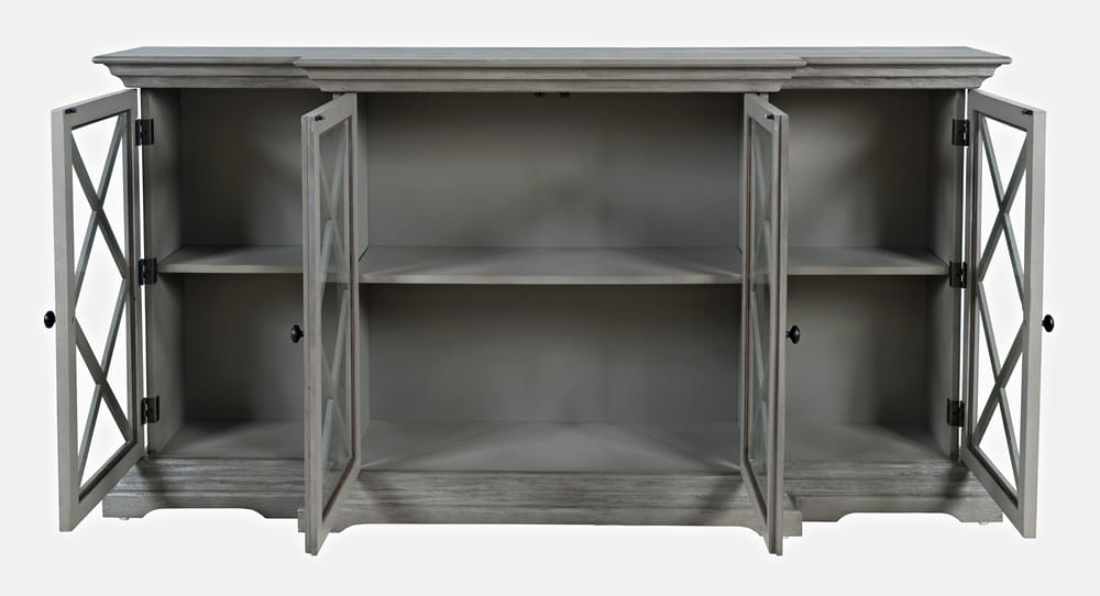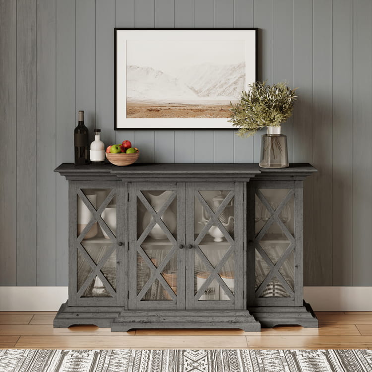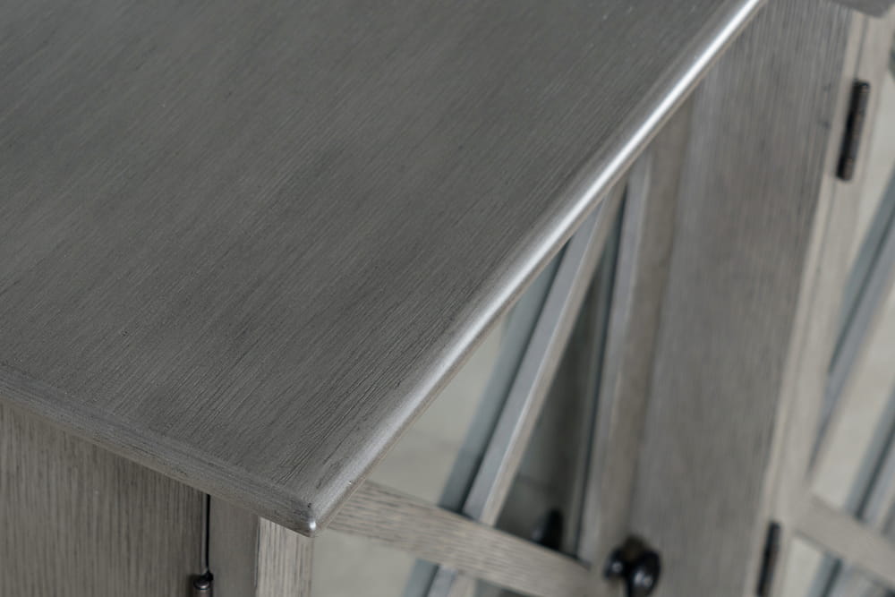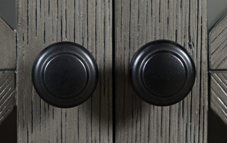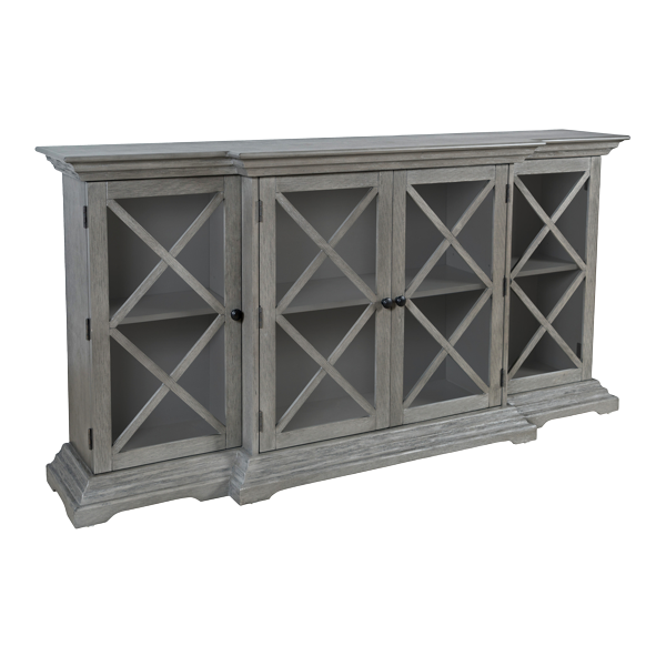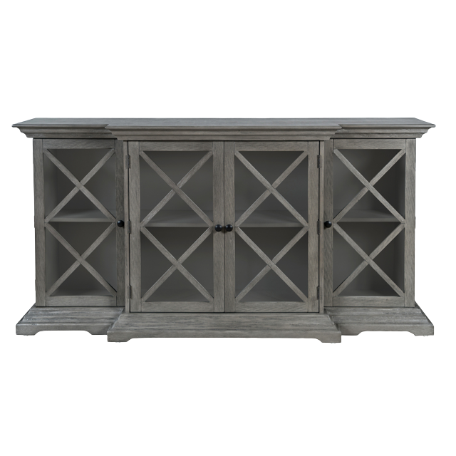 Elegancka komoda w stylu Hamptons w kolorze rustykalnym szarym (postarzany), z ozdobnymi zawiasami zewnętrznymi. Korpus został wykonany z drewna akacji i posiada szczotkowaną powierzchnię, malowaną na jednolity brązowy kolor. Przeszklone fronty posiadają ozdobne szprosy, które nadają niebanalnego charakteru całości komody, a także frezowany cokół i krawędzie blatu. Ciekawa forma w postaci poczwórnych drzwi, w tym dwóch wysuniętych do przodu sprawiają, że mebel prezentuje się atrakcyjnie w każdym wnętrzu. Wymiary produktu pozwolą na wypełnienie przestrzeni i funkcjonalne przechowywanie.