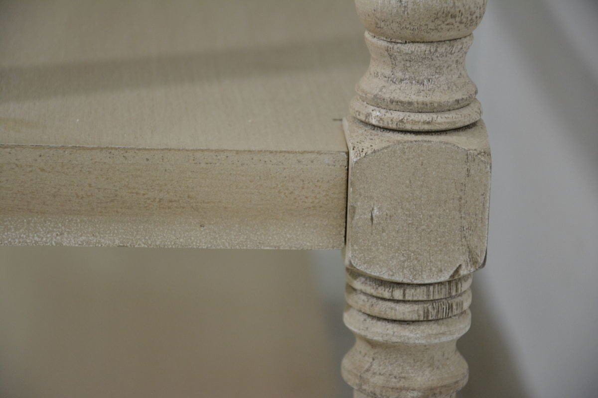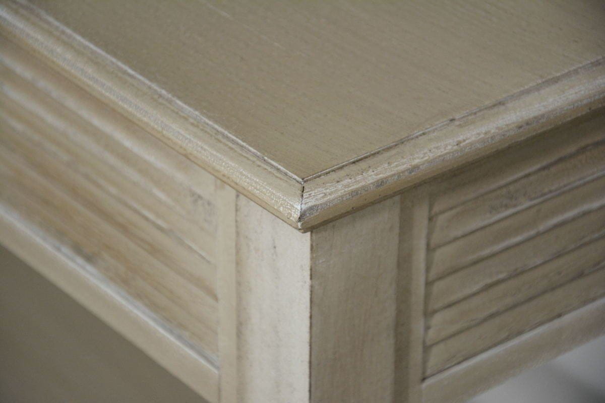 Ta uniwersalna konsola doskonale uzupełni każde nowoczesne oraz tradycyjne wnętrze. Posiada dekoracyjne szuflady i toczone nogi. Wykonana jest z drewna z białymi przetarciami, co sprawia że jej kolor jest niejednolity. Bez wątpienia ta interesująca forma frontów i przecierany lakier konsoli dodają konsoli uroku.