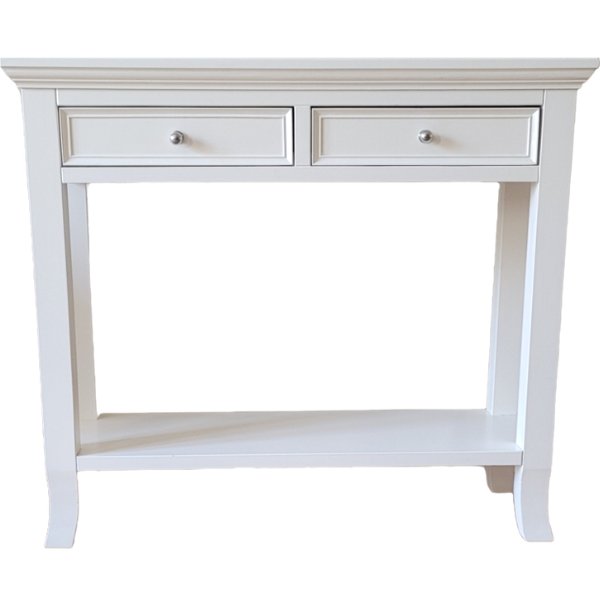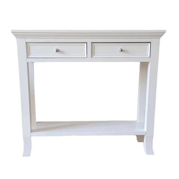 Piękna konsola z dwoma szufladami i ozdobnie wygiętymi nogami, nadającymi jej lekkości i subtelności. Charakterystyczny jest dla niej elegancki, frezowany blat. Wyrazistości dodają jej także dekoracyjne frezy na szufladach. Wyróżnia się klasyczną formą i ponadczasowym wzornictwem.
