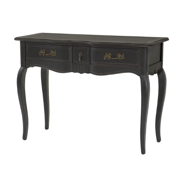 Elegancka w pełni drewniana konsola na giętych, frezowanych nogach. Konsola posiada trzy frezowane szuflady oraz ozdobne, metalowe uchwyty w kolorze ciemnego mosiądzu. Mebel ten będzie piękną ozdobą wnętrza.